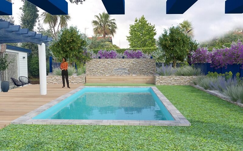 - Reprise complète du dallage autour de la piscine avec des dalles en opus romain travertin.
